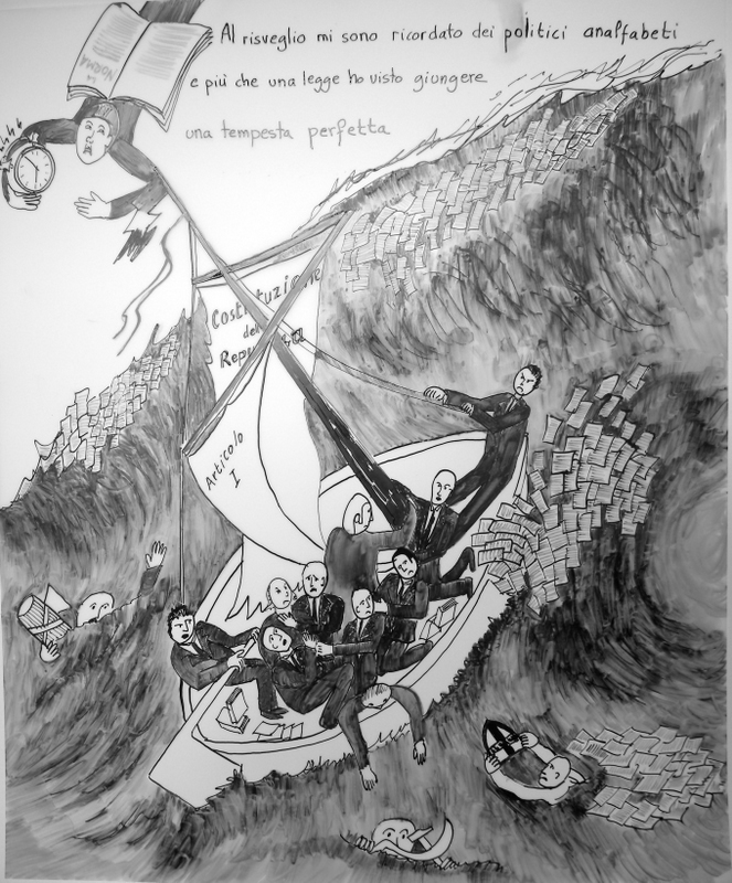 Pubblicato il 11 luglio 201011 luglio 2010 di editorStriscia: L’Uomo Norma Sogna la Legge Perfetta Ho sognato la legge perfetta una costituzione leggere, aerea scritta dagli uomini di tutto il mondo Al risveglio mi sono ricordato dei politici analfabeti e piu che una legge ho visto giungere una tempesta perfetta